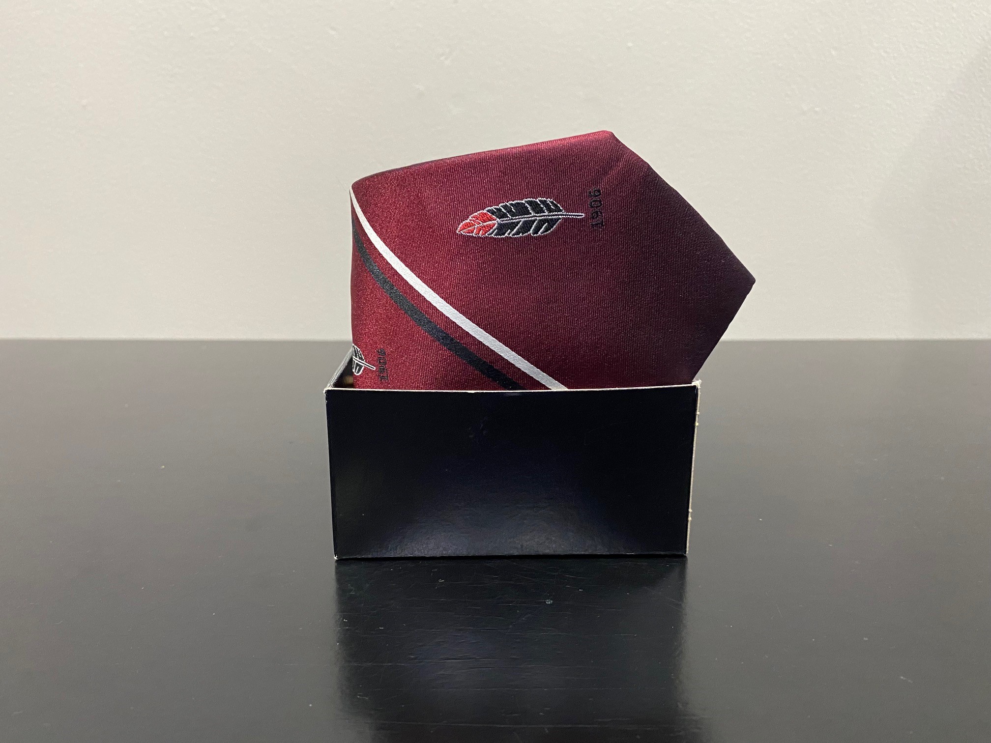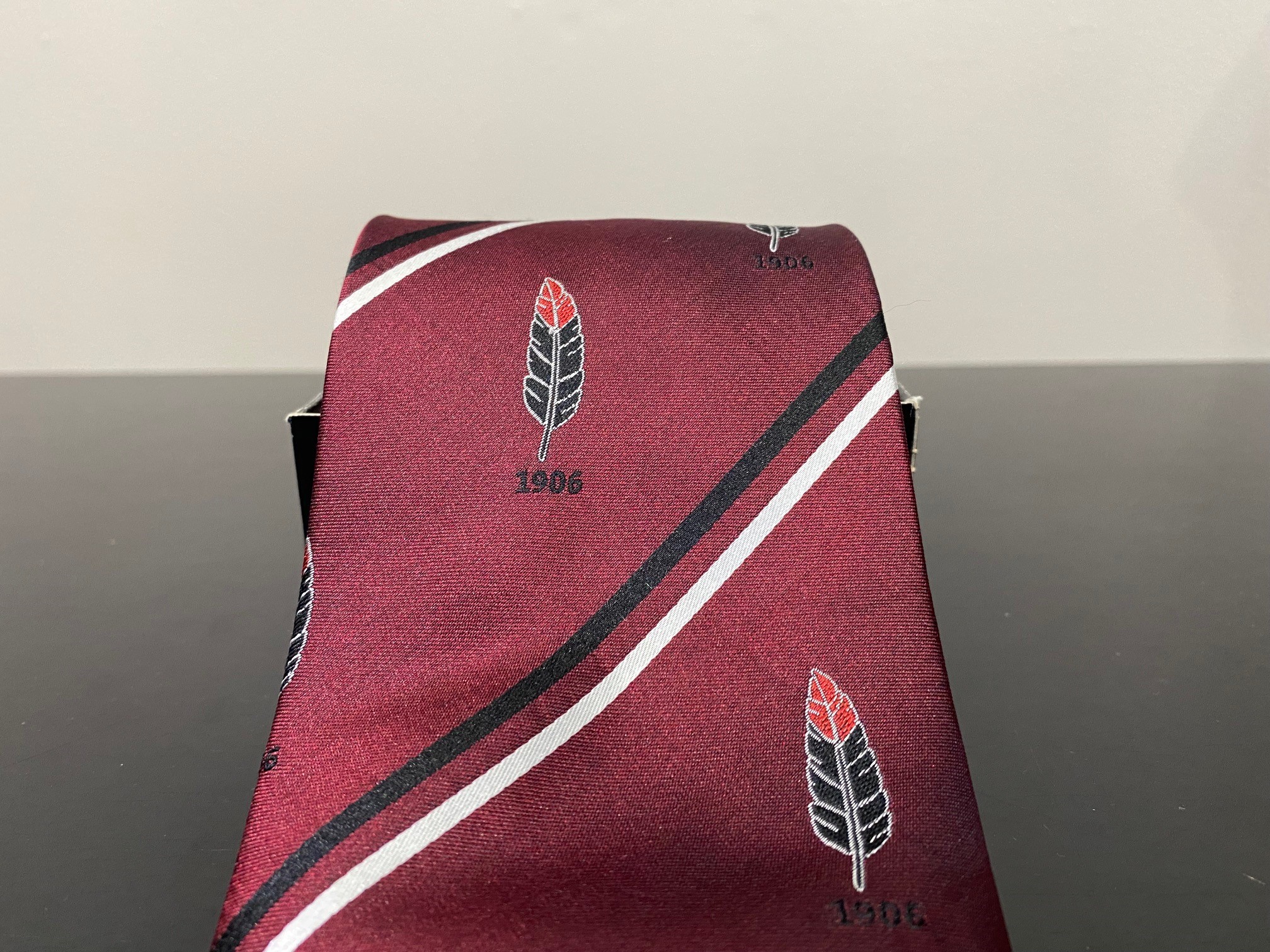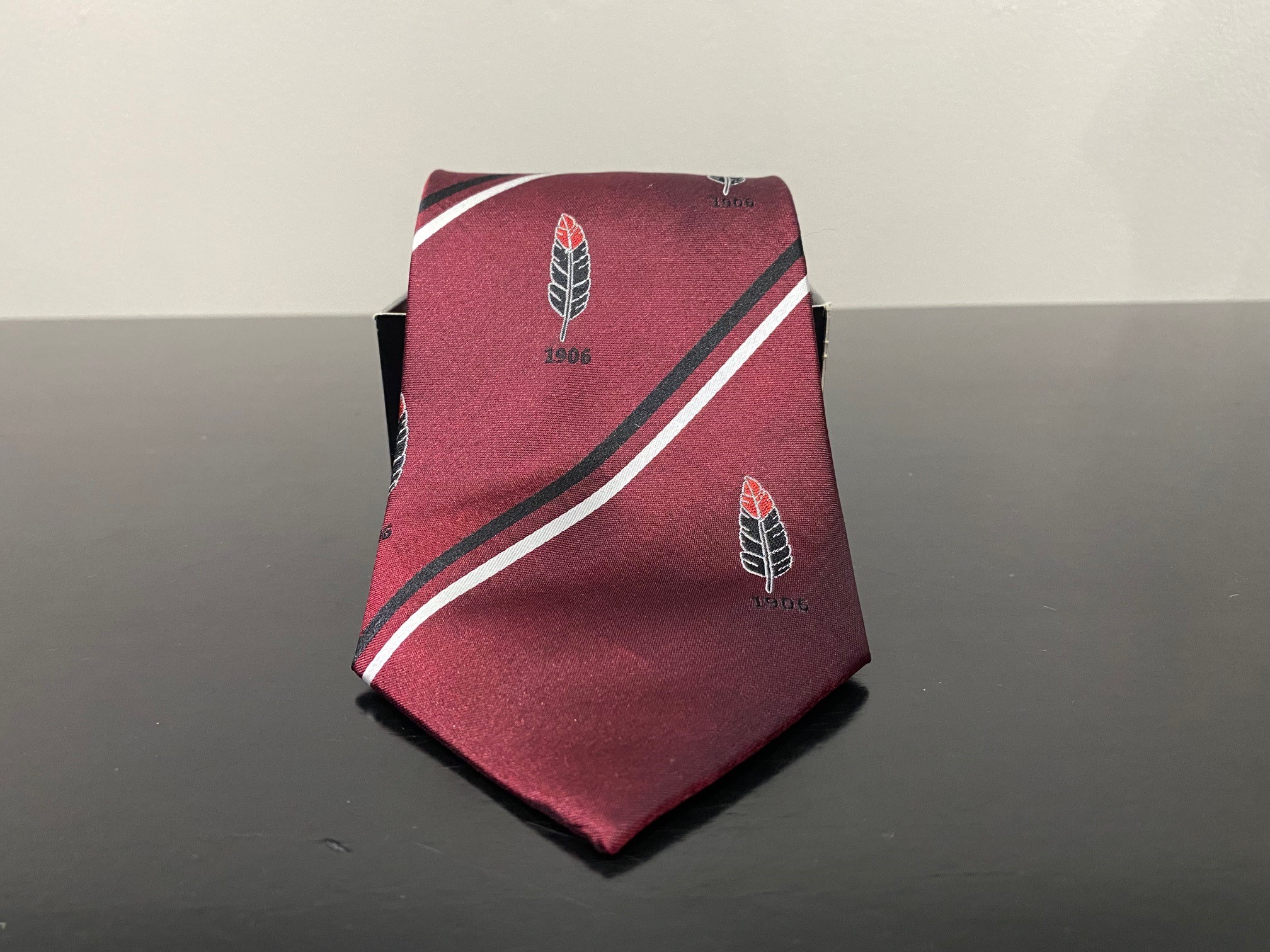 Represent Mississaugua with the Handmade MGCC Club Tie. Colour: Rosewood Burgundy 1906 + Feather Logo